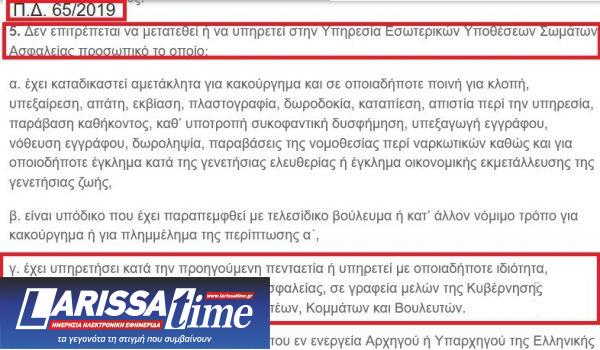 Δηλαδή φέρεται να επιχειρήθηκε να ενταχθεί με τις συγκεκριμένες «συστάσεις» αστυνομικός στην Υπηρεσία Εσωτερικών Υποθέσεων της ΕΛ.ΑΣ. παρ ότι το Προεδρικό Διάταγμα 65/2019 που διέπει την λειτουργία των «αδιάφθορων» αναφέρει (αρθρο 20) ότι δεν μπορεί να υπηρετήσουν σε αυτούς «όποιος έχει υπηρετήσει κατά την προηγούμενη πενταετία ή υπηρετεί με οποιαδήποτε ιδιότητα, συμπεριλαμβανομένου του προσωπικού ασφαλείας, σε γραφεία μελών της Κυβέρνησης, Υφυπουργών, Γενικών και Ειδικών Γραμματέων, Κομμάτων και Βουλευτών» . Προκειμένου ακριβώς να μην αλλοιώνονται τα δεδομένα των ερευνών για υποθέσεις επίορκων κρατικών λειτουργών από αστυνομικούς που είναι στο περιβάλλον κυβερνητικών στελεχών.
