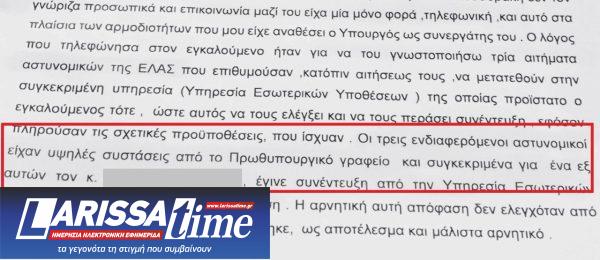 Στην κατάθεση του λοιπόν ο μετακλητός συνεργάτης του υπουργού παραδέχθηκε στην κατάθεση του Μαΐου ότι «ο λόγος που τηλεφώνησα στον εγκαλούμενο (σ.σ τον πρώην ανώτατο αξιωματικό των αδιάφθορων» της ΕΛ.ΑΣ. ) ήταν για να του γνωστοποιήσω τρία αιτήματα αστυνομικών της ΕΛ.ΑΣ. που επιθυμούσαν κατόπιν αιτήσεων τους να μετατεθούν στην συγκεκριμένη υπηρεσία της οποίας προίστατο ο εγκαλούμενος , ώστε αυτός να τους ελέγξει και να τους περάσει συνέντευξη , εφ όσον πληρούσαν τις σχετικές προϋποθέσεις που ίσχυαν».