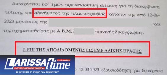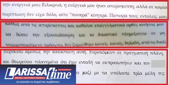 Μάλιστα αναρωτήθηκε πως οι αντίδικοι ανεκάλυψαν αυτή την πλαστογραφία. Ετσι διατύπωσε τον ισχυρισμό ότι ένας εξ αυτών το πληροφορήθηκε όταν συνάντησε τον υποτιθέμενο υπογράφοντα την εξουσιοδότηση σε λαϊκή αγορά της Λάρισας!