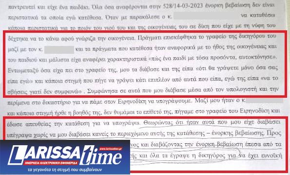 ΠΡΩΤΟΝ: Είναι χαρακτηριστικό όπως αποκαλύπτει το ”in” ότι όταν ρωτήθηκε από τους αρμόδιους ερευνητές του Υπουργείου Δικαιοσύνης-στα πλαίσια της ΕΔΕ για τις «αποκαλύψεις» της σε ΜΜΕ – γιατί ενώ εμφανίζει τον ιατροδικαστή να της ζητά τάχα το χρηματικό ποσό στις αρχές του 2024 δεν απευθύνθηκε στις αρχές στο μεσοδιάστημα και επανήλθε έναν χρόνο αργότερα με τηλεοπτική καταγγελία . Εκείνη λοιπόν έδωσε την …αποστομωτική απάντηση « ο λόγος που δεν κατήγγειλα τα περιστατικά είναι γιατί αν ξεκινήσουμε να καταγγέλλουμε διεφθαρμένους δημοσίους υπαλλήλους σε μία επαρχιακή πόλη όπως η Λάρισα, δεν θα μπορέσουμε να κάνουμε την δουλειά μας στην καθημερινότητα μας». Με τον υπάλληλο του Υπουργείου Δικαιοσύνης να αναρωτιέται «αφού φέτος κάνατε την καταγγελία δεν φοβόσαστε τώρα ότι θα υποστείτε αυτά που μου αναφέρατε προηγουμένως». Με την ίδια να αποφεύγει ν απαντήσει στην ουσία για αυτή την καταφανή αντίφαση των ισχυρισμών της.
