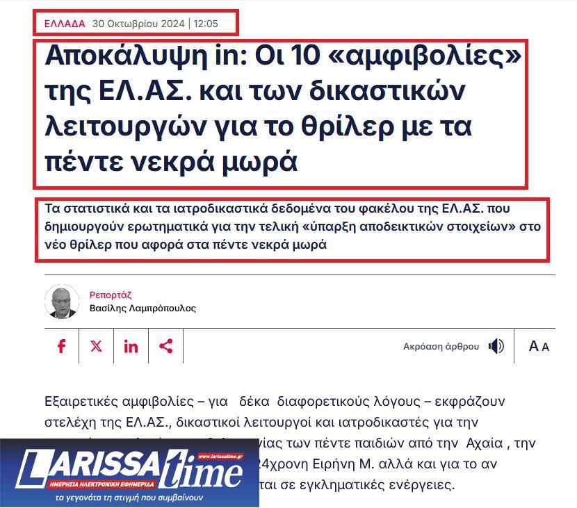 Κι είναι ενδεικτικό το ρεπορτάζ του in από τις 30 Οκτωβρίου 2024 που αναφερόταν στις «10 »αμφιβολίες» της ΕΛ.ΑΣ. και των δικαστικών λειτουργών για το θρίλερ με τα πέντε νεκρά μωρά».