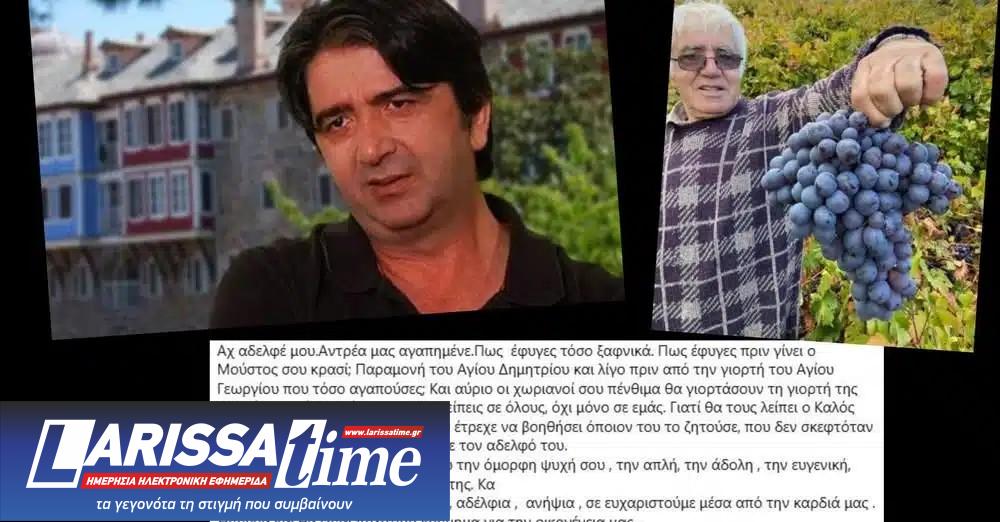 «Αχ αδελφέ μου. Αντρέα μας αγαπημένε. Πως έφυγες τόσο ξαφνικά. Πως έφυγες πριν γίνει ο Μούστος σου κρασί; Παραμονή του Αγίου Δημητρίου και λίγο πριν από την γιορτή του Αγίου Γεωργίου που τόσο αγαπούσες; Και αύριο οι χωριανοί σου πένθιμα θα γιορτάσουν τη γιορτή της Ζιβανίας γιατί Θα λείπεις εσυ. Θα λείπεις σε όλους, όχι μόνο σε εμάς. Γιατί θα τους λείπει ο Καλός άνθρωπος της Άλωνας . Αυτός που έτρεχε να βοηθήσει όποιον του το ζητούσε, που δεν σκεφτόταν κόπο και χρόνο ,φτάνει να ανάπαυε τον αδελφό του. Όλοι θα εύχονται για την ψυχή σου την όμορφη ψυχή σου , την απλή, την άδολη , την ευγενική, που όλο τον κόσμο χωρούσε μέσα της. Όλοι μας, γυναίκα, παιδιά , εγγόνια, αδέλφια , ανίψια , σε ευχαριστούμε μέσα από την καρδιά μας. Ήσουνα και θα είσαι πολύτιμο κόσμημα για την οικογένεια μας . Φωτεινό παράδειγμα για όλους μας. Περήφανοι θα σε υποδεχτούν και οι γονιοί μας . Τίμησες το όνομα τους . Εύχεσαι να τα καταφέρουμε κι εμείς. Καλό παράδεισο αδελφέ μου», έγραψε.