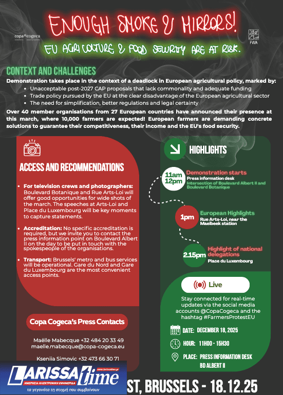 Την Πέμπτη 18 Δεκεμβρίου, 10.000 αγρότες από περισσότερους από 40 εθνικούς οργανισμούς από 27 κράτη μέλη θα πραγματοποιήσουν πορεία για να επισημάνουν το βάθος της κρίσης που αντιμετωπίζει ο τομέας, με βασικά αιτήματα προς τα θεσμικά όργανα της ΕΕ, μεταξύ των οποίων ένα δίκαιο και διαφανές εμπόριο.