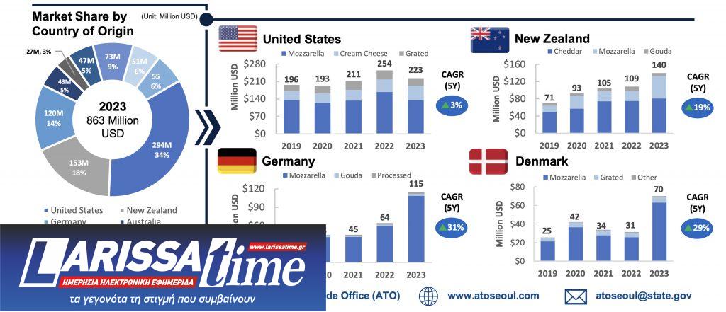Οι ΗΠΑ αποτελούν την κύρια προμηθευτή τυριού στην αγορά της Noτίου Κορέας, κατέχοντας ένα μερίδιο αγοράς που άγγιζε το 34% το 2023, όμως σταδιακά αρχίζει να «νιώθει την ανάσα» και άλλων χωρών, ιδίως της Νέας Ζηλανδίας, της Γερμανίας και της Δανίας που φαίνεται να έχουν αντιληφθεί τις σημαντικές ευκαιρίες που παρουσιάζει η συγκεκριμένη αγορά. Από άποψη προϊόντων, περισσότερο από το 50% των εισαγωγών τυροκομικών προϊόντων στην αγορά της Νοτίου Κορέας αφορούν τη mozzarella, ενώ αυξημένη ζήτηση υπάρχει και για άλλες κατηγορίες, όπως το τσένταρ, τα κρεμώδη και τα επεξεργασμένα τυριά.