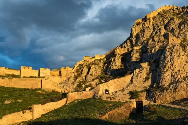 Η πρώτη πύλη έχει καταρρεύσει σχεδόν ολοκληρωτικά. Εκατό μέτρα πιο πέρα, στη δεύτερη πύλη, ξεκινά ο ελικοειδής δρόμος που φτάνει στην τρίτη πύλη και το κυρίως κάστρο. Από την περιήγηση στο χώρο, διατηρείται η δεξαμενή νερού, την πρώτη κρήνη που απέκτησε το κάστρο χάρη στον βασιλιά Σίσυφο για να λύσει το πρόβλημα της λειψυδρίας.