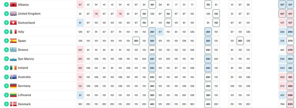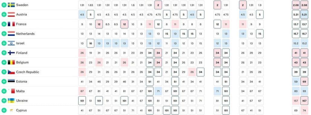 Η Κύπρος, που βρίσκεται πλέον 12η , έχει ανέβει τρεις θέσεις, μία από τις λίγες συμμετοχές που δείχνουν σταθερή δυναμική. Το «Σσσς» του Theo Evan κερδίζει έδαφος, με αποδόσεις που κυμαίνονται από 34 έως 101. Είναι ενδιαφέρον ότι, σε ορισμένες αγορές, η Κύπρος ήδη στοιχηματίζεται ως μία από τις 10 κορυφαίες.
