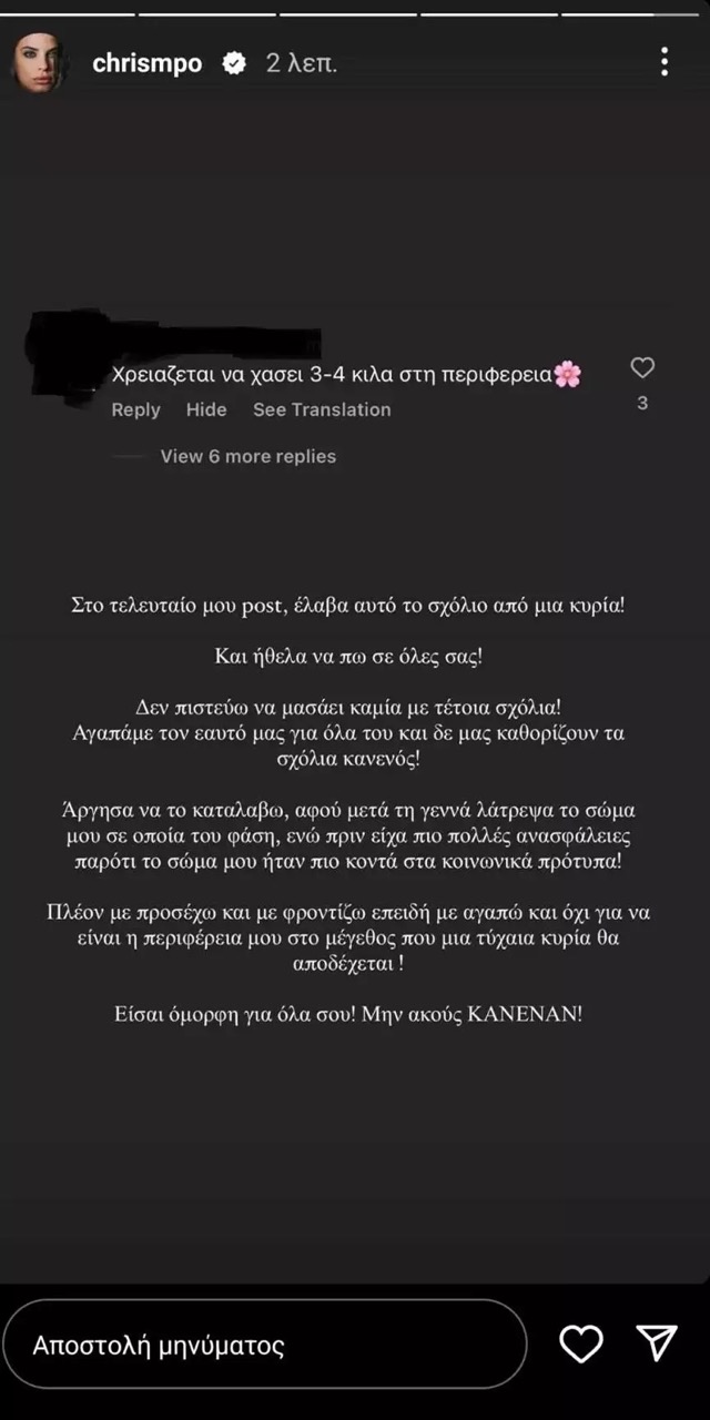 Η Χριστίνα Μπόμπα, δημοσίευσε το σχόλιο αυτό στα stories της και απάντησε γράφοντας: «Στο τελευταίο μου ποστ έλαβα αυτό το σχόλιο από μια κυρία. Και ήθελα να πω σε όλες σας. Δεν πιστεύω να μασάει καμία με τέτοια σχόλια. Αγαπάμε τον εαυτό μας για όλα του και δεν μας καθορίζουν τα σχόλια κανενός.
