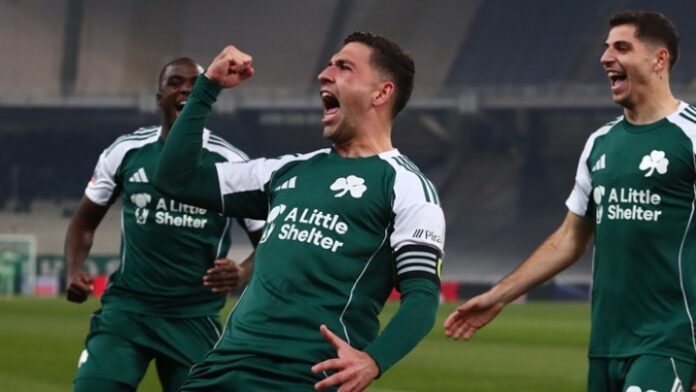 Λήξη αγώνα στο ΟΑΚΑ. Νίκη-πρόκριση για την ομάδα μας στα ημιτελικά με χατ-τρικ του αρχηγού Τάσου Μπακασέτα! #Panathinaikos #PAOFC #PAOARIS #GreekCup #GB32 pic.twitter.com/iTZyc0lNAV