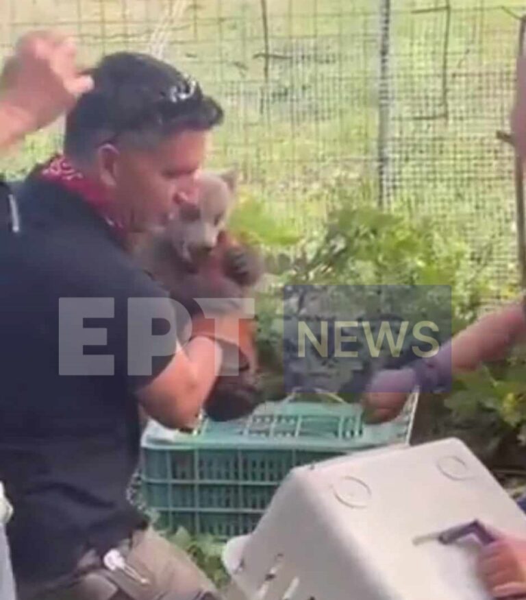Ο ιδιοκτήτης με τη βοήθεια γειτόνων κατόρθωσε να παγιδέψει το αρκουδάκι σε ένα πλαστικό τελάρο.