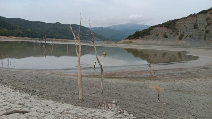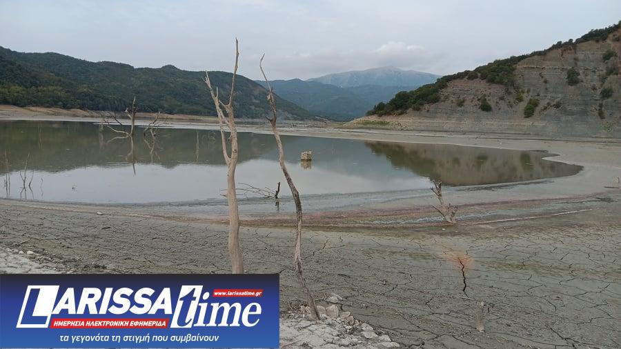 Καθώς πλησιάζουμε στην όχθη, το τοπίο καθηλώνει τον επισκέπτη. Με το μάτι αντιλαμβανόμαστε, πως η στάθμη των υδάτων, έχει υποχωρήσει κατά πολλά μέτρα. Απόλυτη ησυχία. Ερείπια πέτρινων σπιτιών και του σχολείου βουτηγμένα στη λάσπη. Κορμοί και ρίζες δένδρων που άντεξαν στο χρόνο και το νερό, μοιάζουν με απολιθώματα. Ο βυθός σε πολλά σημεία, έχει τελείως στεγνώσει.