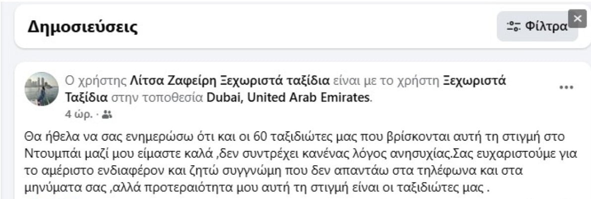 «θα ήθελα να σας ενημερώσω ότι και οι 60 ταξιδιώτες μας που βρίσκονται αυτή τη στιγμή στο Ντουμπάι μαζί μου είμαστε καλά ,δεν συντρέχει κανένας λόγος ανησυχίας. Σας ευχαριστούμε για το αμέριστο ενδιαφέρον και ζητώ συγγνώμη που δεν απαντάω στα τηλέφωνα και στα μηνύματα σας, αλλά προτεραιότητα μου αυτή τη στιγμή είναι οι ταξιδιώτες μας», έγραψε σε ανάρτησή της.