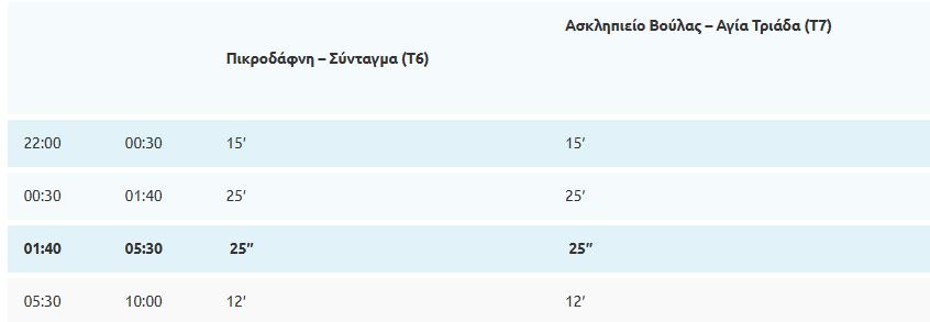 Συχνότητες διέλευσης γραμμών Τ6 και Τ7 του Τραμ από 22:00 έως 10:00
