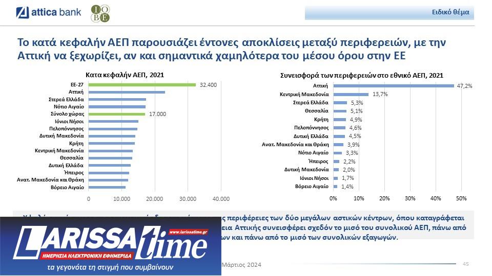 συγκέντρωση της οικονομικής δραστηριότητας στις περιφέρειες των δύο μεγάλων αστικών κέντρων, όπου καταγράφεται πάνω από το μισό των συνολικών επενδύσεων. Η περιφέρεια Αττικής συνεισφέρει σχεδόν το μισό του συνολικού ΑΕΠ, πάνω από το ένα τρίτο των συνολικών επενδύσεων και πάνω από το μισό των συνολικών εξαγωγών.