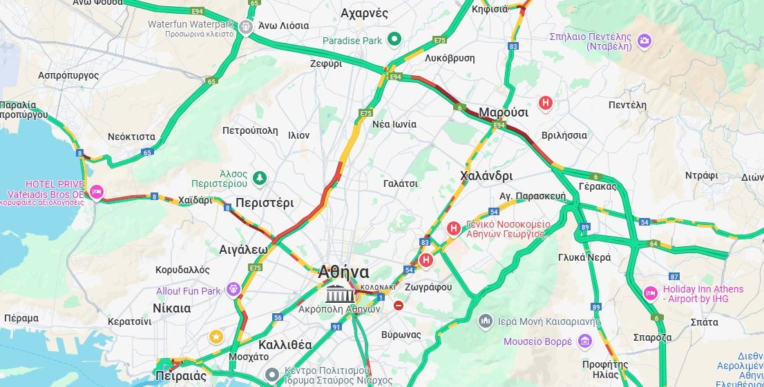 Με δυσκολίες διεξάγεται η κυκλοφορία και στον Κηφισό, στο ρεύμα καθόδου, όπου τα οχήματα κινούνται με χαμηλές ταχύτητες μέχρι το Αιγάλεω.