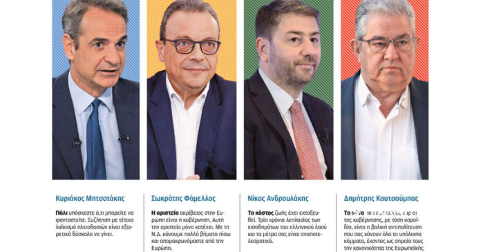 «Ηρθε η ώρα οι πολίτες να δώσουν τέλος σε αυτόν τον κατήφορο και να διεκδικήσουν με την ψήφο τους μια ανατροπή που θα δίνει προοπτική, που θα δίνει δημοκρατία, που θα δίνει πρόοδο, που θα δίνει δικαιοσύνη, που θα δίνει ευημερία. Αυτή την προοπτική στις ευρωεκλογές μπορεί να την εξασφαλίσει μόνο ο ΣΥΡΙΖΑ», απάντησε ο κ. Φάμελλος. Με ανάλογα επιχειρήματα εμφανίστηκαν να διεκδικούν την ψήφο οι αρχηγοί των υπόλοιπων κομμάτων.