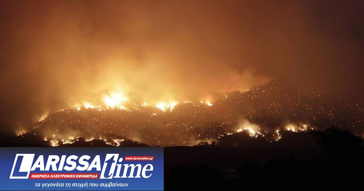 Φωτογραφίες που τραβήχτηκαν στην αρχή της εβδομάδας δείχνουν τον νυχτερινό ουρανό βαμμένο πορτοκαλί και φλόγες να κατατρώνε θαμνώδη περιοχή.