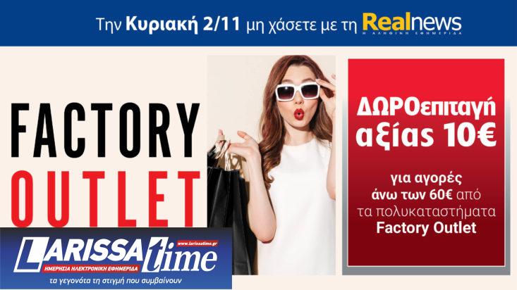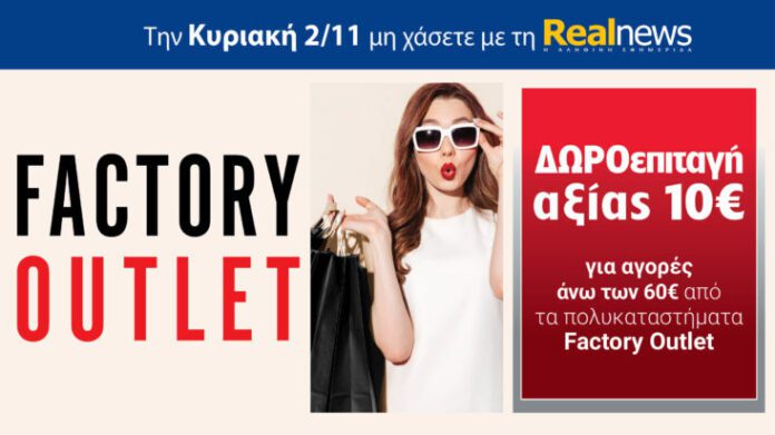 Δωροεπιταγή αξίας 10€ για αγορές άνω των 60€ από τα πολυκαταστήματα Factory Outlet. H προσφορά ισχύει και στην απλή έκδοση