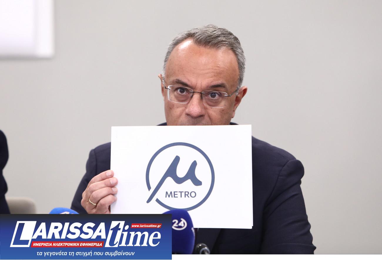 Ο Χρήστος Σταϊκούρας με το λογότυπο του μετρό