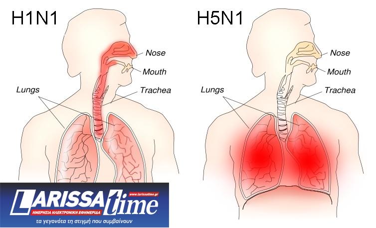 Με κόκκινο χρώμα, οι περιοχές του οργανισμού που επηρεάζουν οι υπότυποι H1N1 και H5N1
