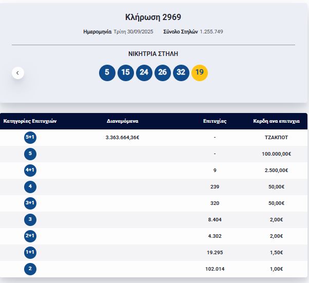 Έγινε η κλήρωση με αριθμό 2969 του ΤΖΟΚΕΡ το βράδυ της Τρίτης (30/9).