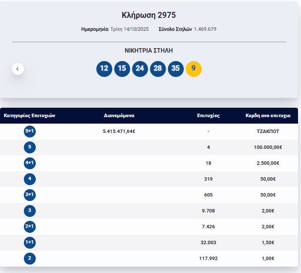 Οι τυχεροί αριθμοί είναι: 12, 15, 24, 28, 35 και ΤΖΟΚΕΡ ο αριθμός: 9.