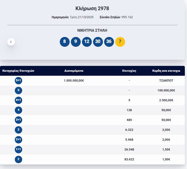 Οι τυχεροί αριθμοί είναι: 8, 9, 12, 30, 36 και ΤΖΟΚΕΡ ο αριθμός: 7.