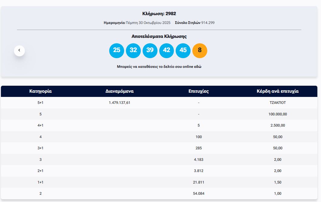 Οι τυχεροί αριθμοί είναι: 25, 32, 39, 42, 45 και ΤΖΟΚΕΡ ο αριθμός: 8.