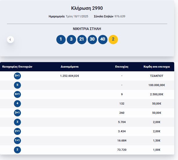 Έγινε η κλήρωση με αριθμό 2990 του ΤΖΟΚΕΡ το βράδυ της Τρίτης (18/11).