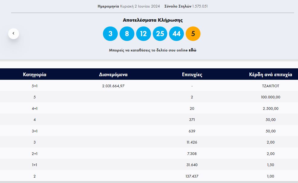 Στην κλήρωση ΤΖΟΚΕΡ, την Κυριακή 2/6/2024 (αριθμός κλήρωσης 2761), οι τυχεροί αριθμοί ήταν οι εξής: