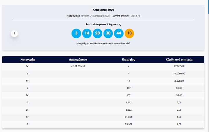 Έγινε η κλήρωση με αριθμό 3006 του ΤΖΟΚΕΡ το βράδυ της Τετάρτης (24/12).