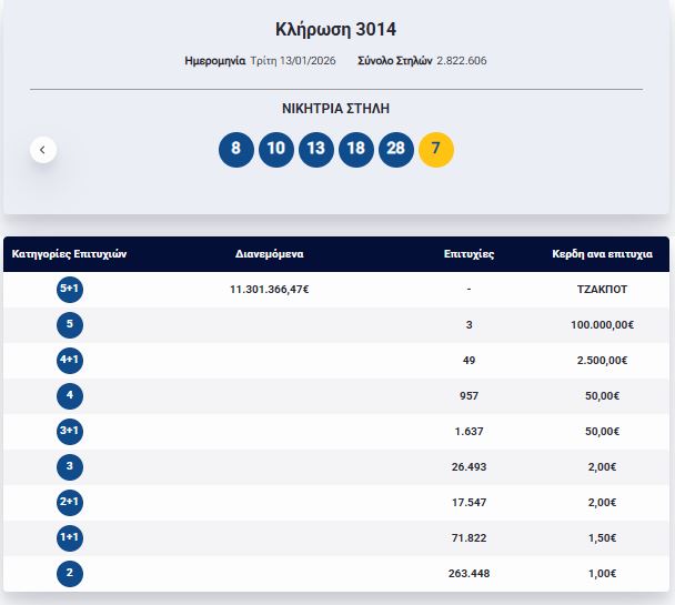 Οι τυχεροί αριθμοί είναι: 8, 10, 13, 18, 28 και ΤΖΟΚΕΡ ο αριθμός 7.