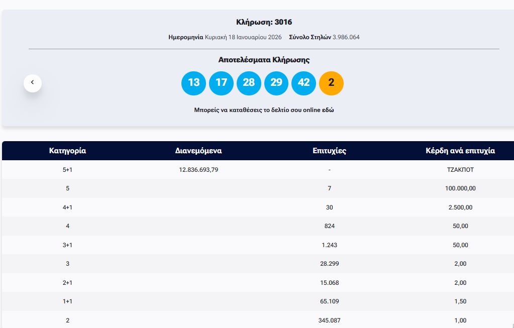 Έγινε το βράδυ της Κυριακής (18/1) η κλήρωση με αριθμό 3016 του ΤΖΟΚΕΡ.