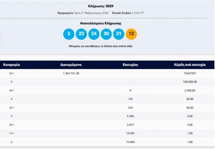 Οι τυχεροί αριθμοί είναι: 2, 23, 24, 30, 31 και ΤΖΟΚΕΡ ο αριθμός 12.