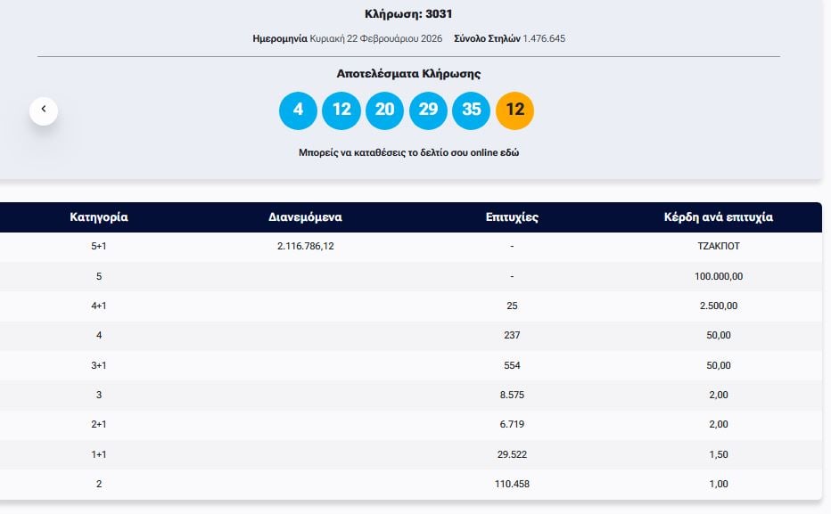 Έγινε το βράδυ της Κυριακής (22/2) η κλήρωση με αριθμό 3031 του ΤΖΟΚΕΡ.