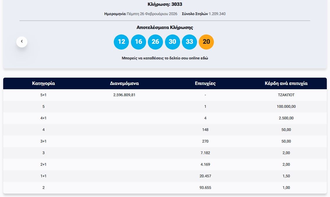 Οι τυχεροί αριθμοί είναι: 12, 15, 26, 30, 33 και ΤΖΟΚΕΡ ο αριθμός 20.