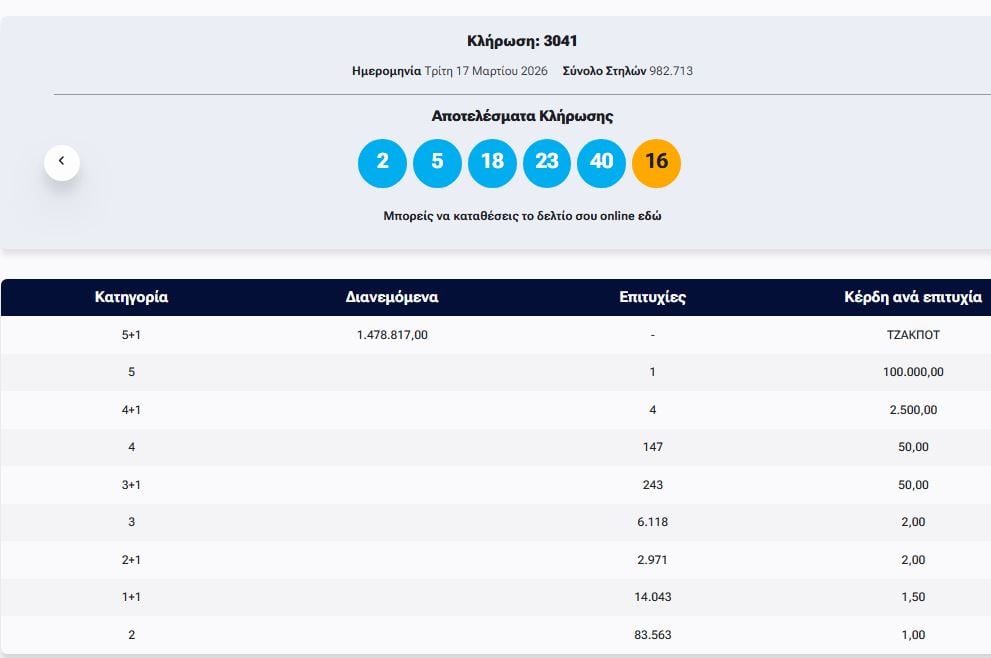 Οι τυχεροί αριθμοί είναι: 2, 5, 18, 23, 40 και ΤΖΟΚΕΡ ο αριθμός 16.