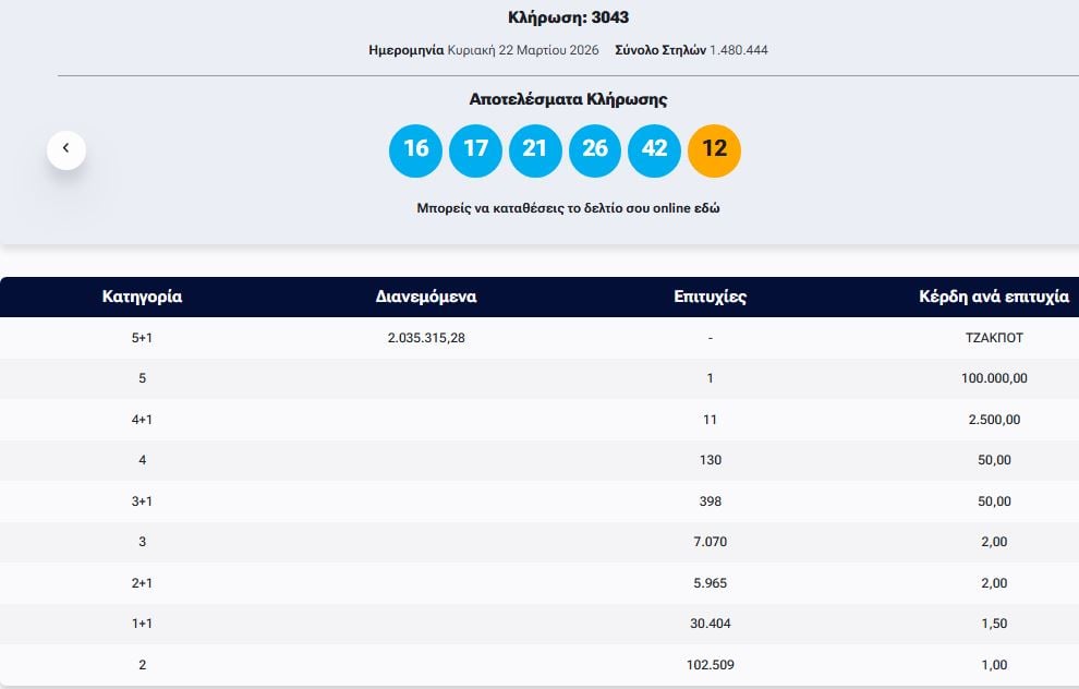 Έγινε το βράδυ της Κυριακής (22/3) η κλήρωση με αριθμό 3043 του ΤΖΟΚΕΡ.