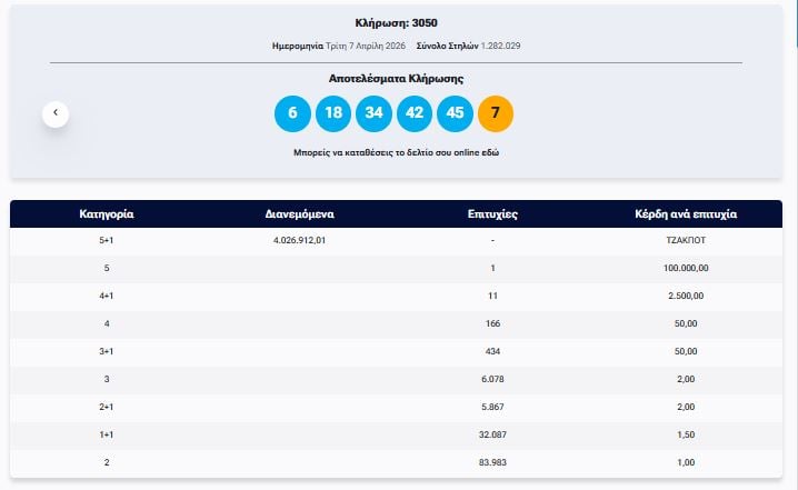 Έγινε το βράδυ της Τρίτης (7/4) η κλήρωση με αριθμό 3050 του ΤΖΟΚΕΡ.
