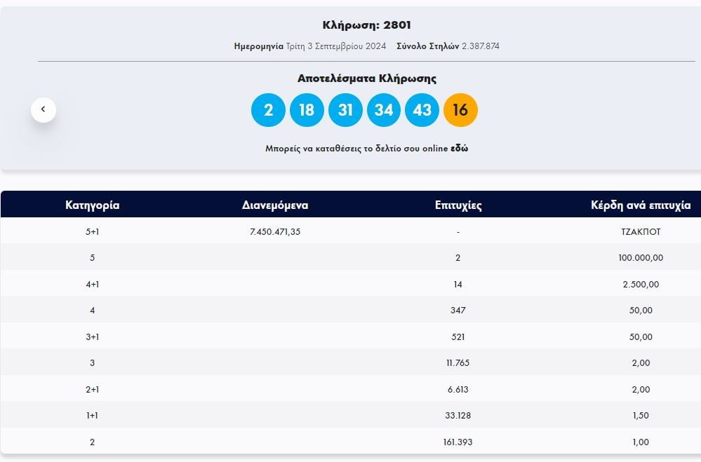Στην κλήρωση ΤΖΟΚΕΡ, την Τρίτη 3/9/2024 (αριθμός κλήρωσης 2801), οι τυχεροί αριθμοί ήταν οι εξής: