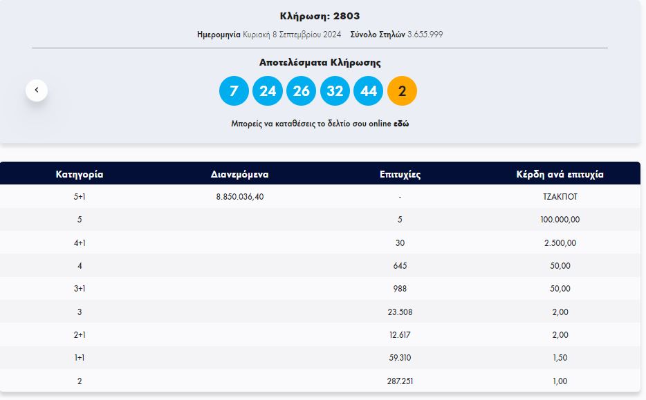 Στην κλήρωση ΤΖΟΚΕΡ, την Κυριακή 8/9/2024 (αριθμός κλήρωσης 2803), οι τυχεροί αριθμοί ήταν οι εξής: