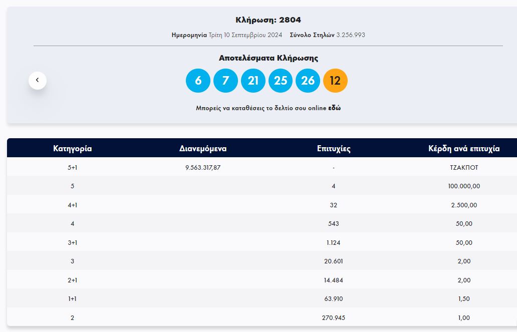Έγινε η κλήρωση με αριθμό 2804 του ΤΖΟΚΕΡ το βράδυ της Τρίτης (10/9) που μοιράζει πάνω από 9.500.000 ευρώ στους νικητές της πρώτης κατηγορίας.