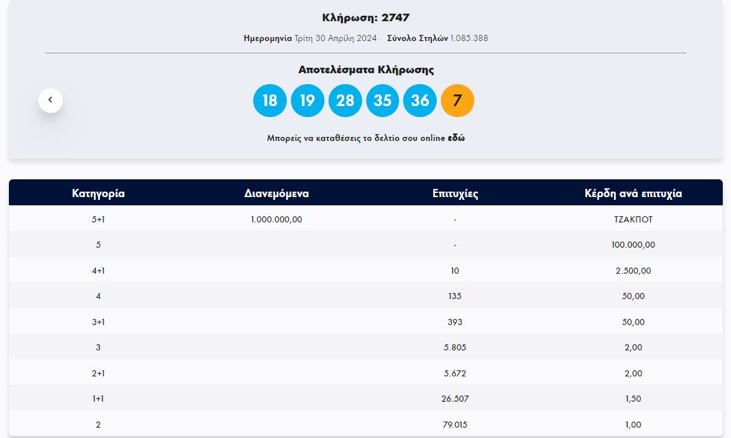 Στην κλήρωση ΤΖΟΚΕΡ, την Τρίτη 30/4/2024 (αριθμός κλήρωσης 2747), οι τυχεροί αριθμοί ήταν οι εξής: