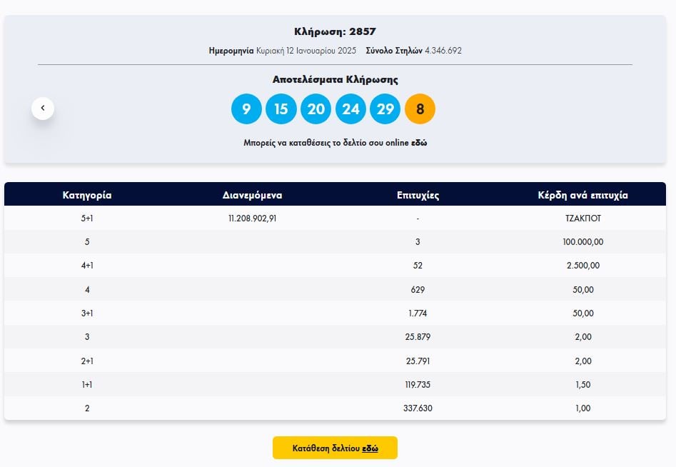 Έγινε η κλήρωση με αριθμό 2857 του ΤΖΟΚΕΡ το βράδυ της Κυριακής (12/1).