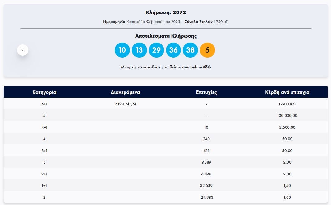 Οι αριθμοί που κερδίζουν είναι οι εξής: 10,13, 29, 36, 38 και ΤΖΟΚΕΡ ο αριθμός: 5.