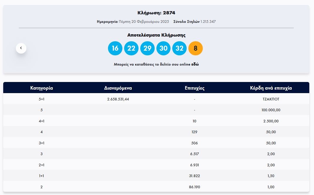 Οι αριθμοί που κερδίζουν είναι οι εξής: 16, 22, 29, 30, 32 και ΤΖΟΚΕΡ ο αριθμός: 8.