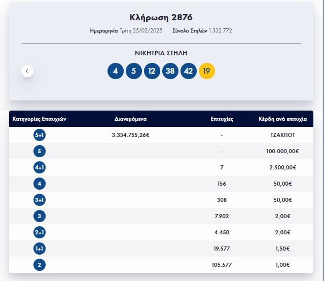 Οι αριθμοί που κερδίζουν είναι οι εξής: 4, 5, 12, 38, 42 και ΤΖΟΚΕΡ ο αριθμός: 19.