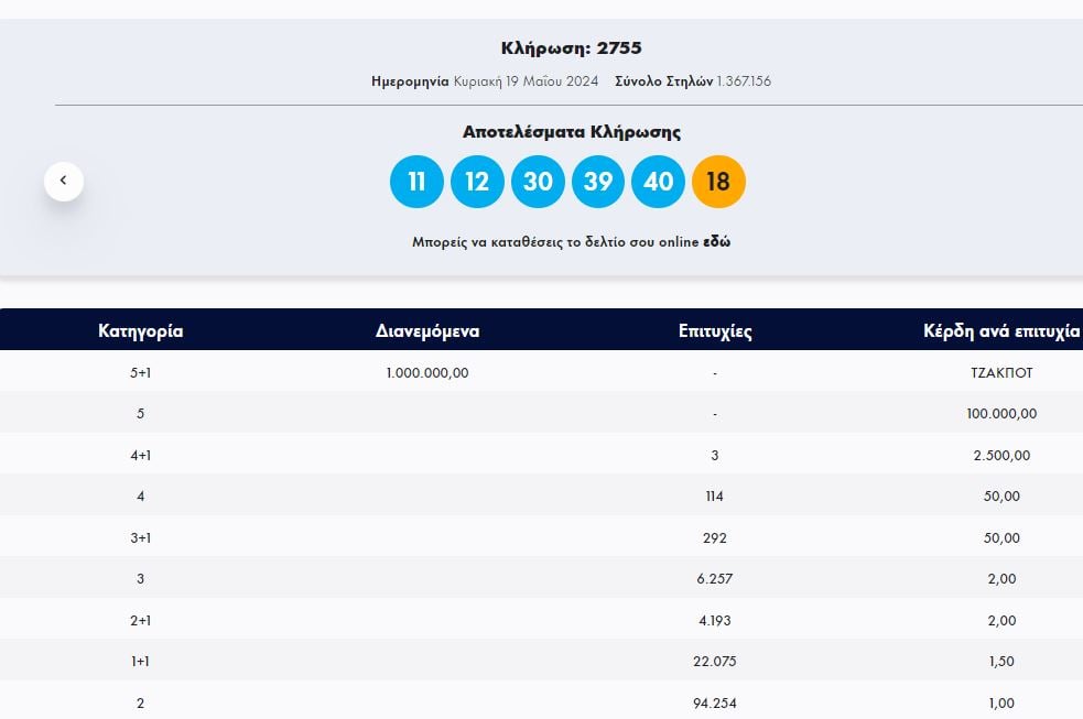 Στην κλήρωση ΤΖΟΚΕΡ, την Κυριακή 19/5/2024 (αριθμός κλήρωσης 2755), οι τυχεροί αριθμοί ήταν οι εξής: