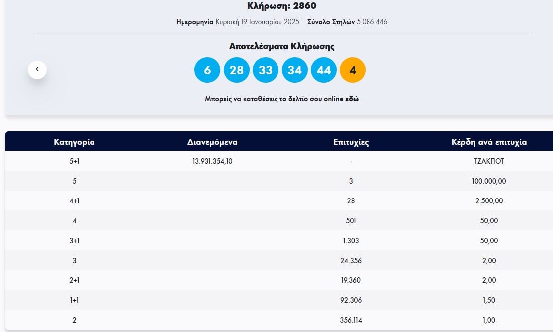 Οι τυχεροί αριθμοί στη σημερινή κλήρωση ΤΖΟΚΕΡ είναι οι εξής: 6, 28, 33, 34, 44 και ΤΖΟΚΕΡ ο αριθμός: 4.