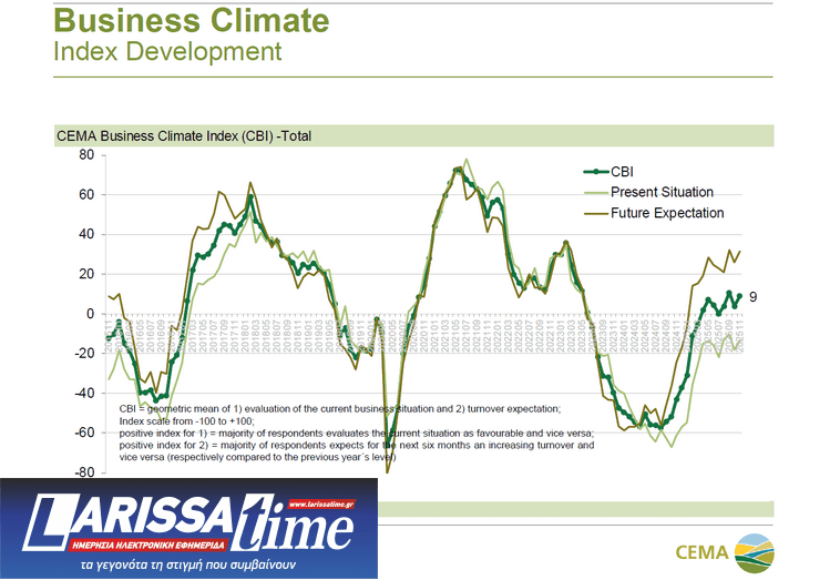 Με το βλέμμα στην ευρωπαϊκή αγορά, οι συμμετέχοντες στην έρευνα της CEMA αύξησαν σημαντικά τις προσδοκίες τους το Νοέμβριο. Από τη μία, ο δείκτης εμπιστοσύνης παραμένει χαμηλός για τη Γαλλία, ειδικά στους τομείς των τρακτέρ και του εξοπλισμού άροσης και συγκομιδής. Από την άλλη, στη Γερμανία ο δείκτης έχει αυξηθεί σημαντικά, με τις θετικές προσδοκίες για άλλες σημαντικές αγορές όπως η Ισπανία, η Ιταλία, το Ηνωμένο Βασίλειο και η Πολωνία να επιβεβαιώνονται.