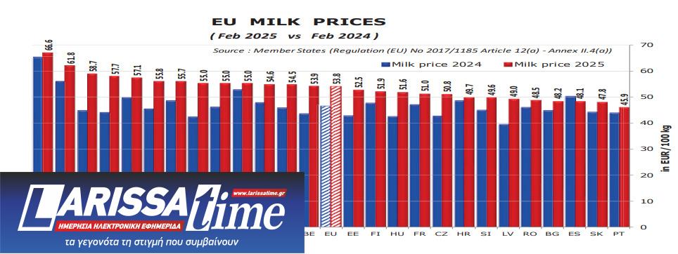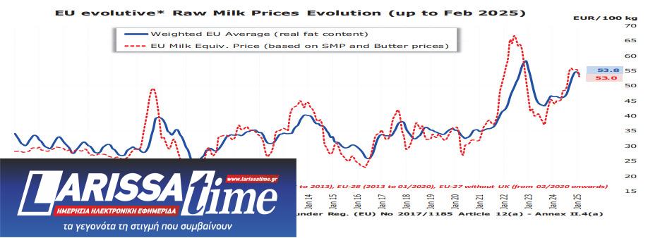 Τον Φεβρουάριο του 2025, η μέση τιμή του αγελαδινού γάλακτος στην τιμή παραγωγού της Ευρωπαϊκής Ένωσης αυξήθηκε κατά +0,6% σε μηνιαία βάση, φτάνοντας τα 0,537 €/kg. Σε σύγκριση με τον Φεβρουάριο του 2024, η αύξηση αγγίζει το +16%. Για τον Μάρτιο του 2025, οι εκτιμήσεις των κρατών μελών προβλέπουν ελαφρά πτώση των τιμών κατά -0,3%.